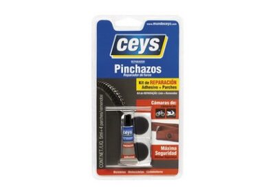 Se trata de un adhesivo propio de Ceys, el cual esta diseñado para reparar pinchazos en cámaras de bicicletas, motocicletas y ciclomotores . Este producto contiene 3 parches redondo, 1 parche ovalado, 1 papel de lija y 1 tubo de adhesivo.