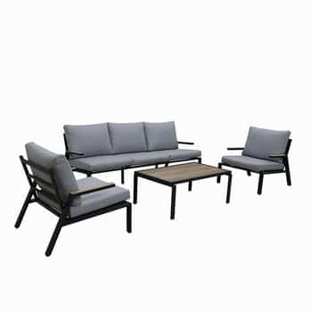 Acero. Mesa con tablero imitación madera. Conín relleno de fibra. Sofá 3 plazas: 75x200xh.68 cm. Sofá individual: 75x76xh.68 cm. Mesa: 100x65xh.41 cm.